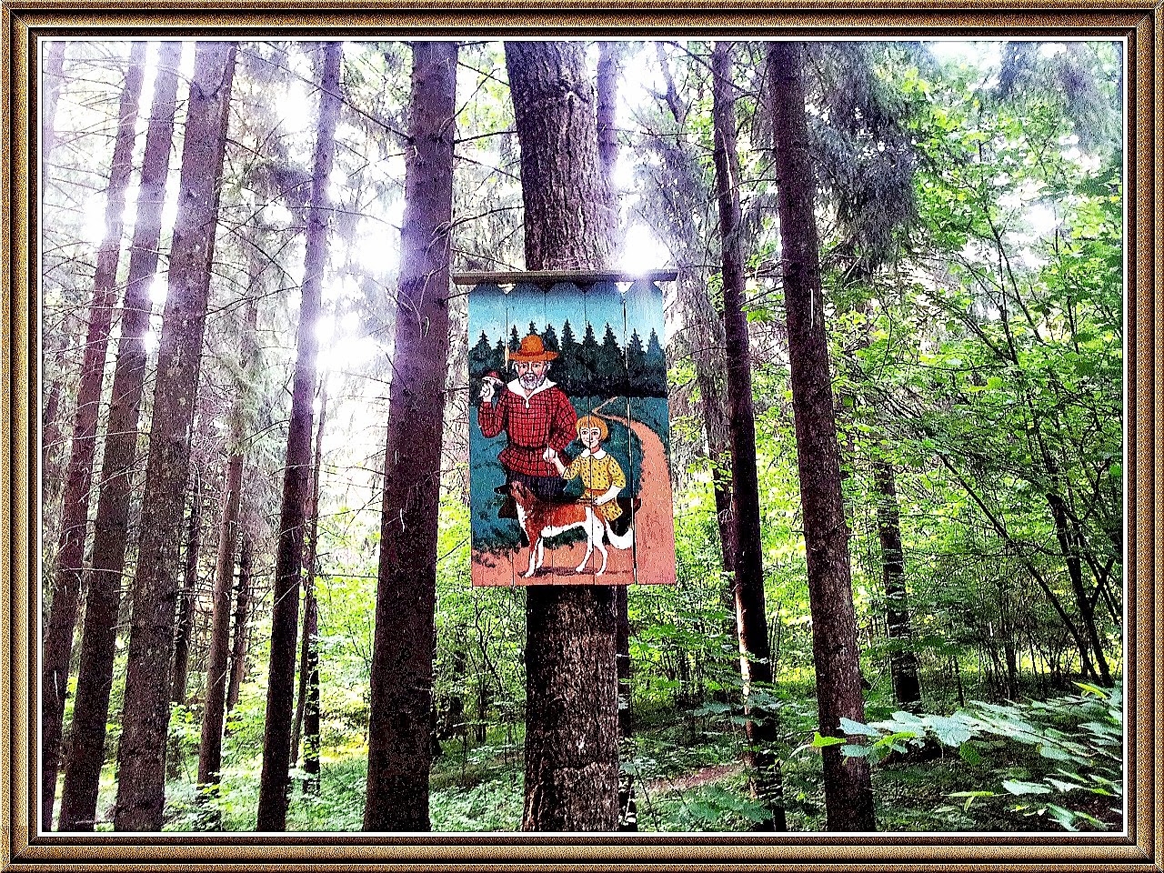 Kildami į kalną aukščiau nuotraukoje matomu keliu, maždaug už šimto metrų nuo informacinio stendo galite pasukti dešiniau gilyn į mišką – taip šiek tiek prailginsite savo kelią, bet nereikės minti į labai stačią įkalnę (tačiau vis tiek reikės minti įkalnėn, nors ir ne tokion stačion).